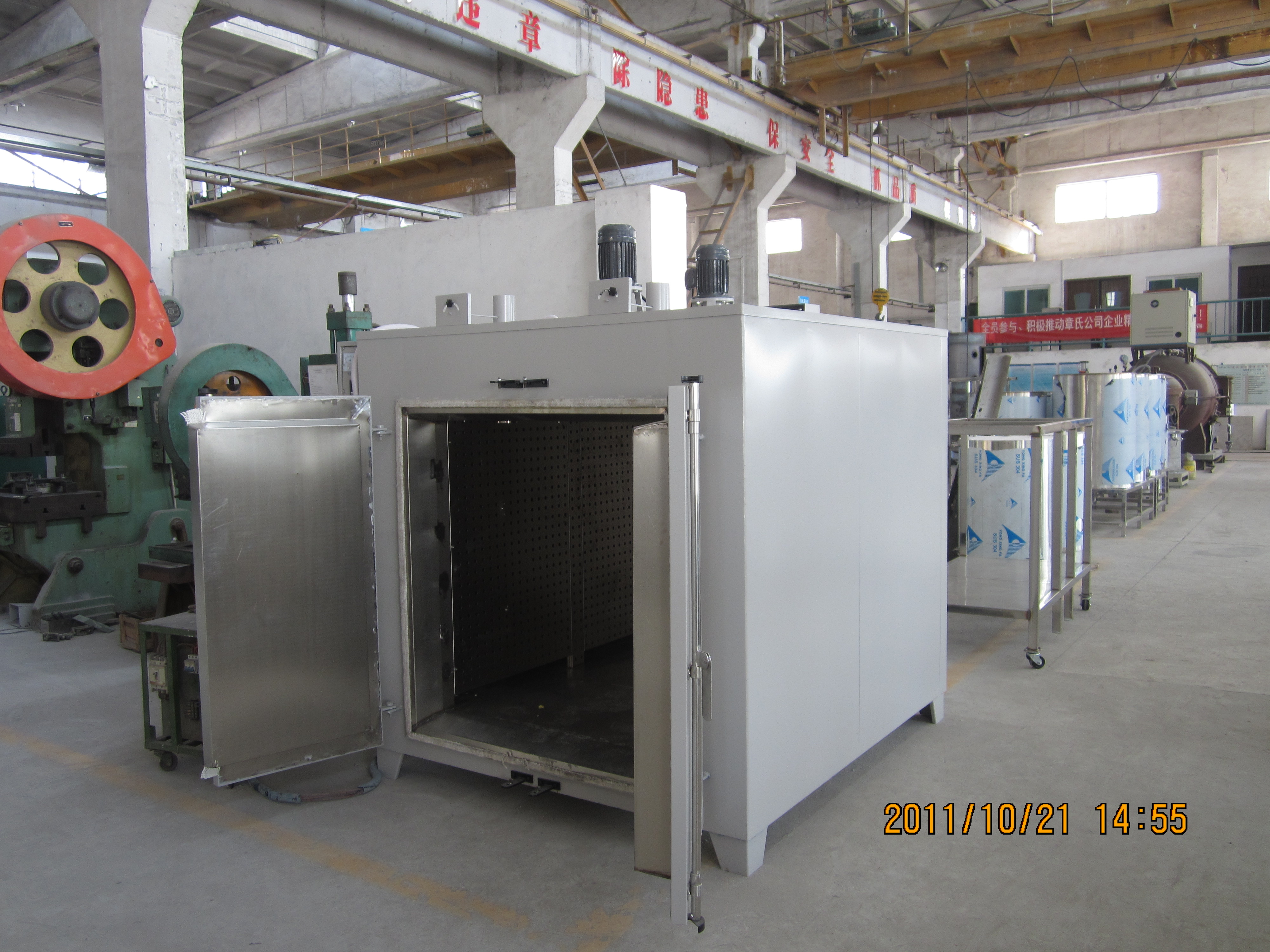 工業(yè)不銹鋼烤箱由鍍鋅板構(gòu)成,工作室與箱體外殼間以玻璃纖維作保溫層材料。開啟箱頂排氣閥可使工作室溫之冷熱空氣得以對(duì)流交換,溫度控制用熱脹式控制器或數(shù)字顯示儀表自動(dòng)恒溫調(diào)節(jié)。全部電器操作設(shè)備均裝于箱側(cè)控制層內(nèi)。不銹鋼烤箱門上安裝觀察窗,試驗(yàn)過程清晰可見。